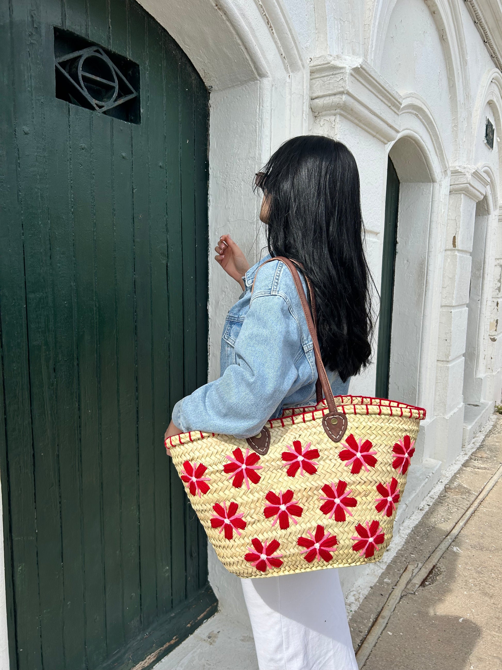 Ce panier en feuille de palmier tressé à la main est sublimé par de délicates fleurs rouges, tissées avec soin pour apporter caractère et originalité.