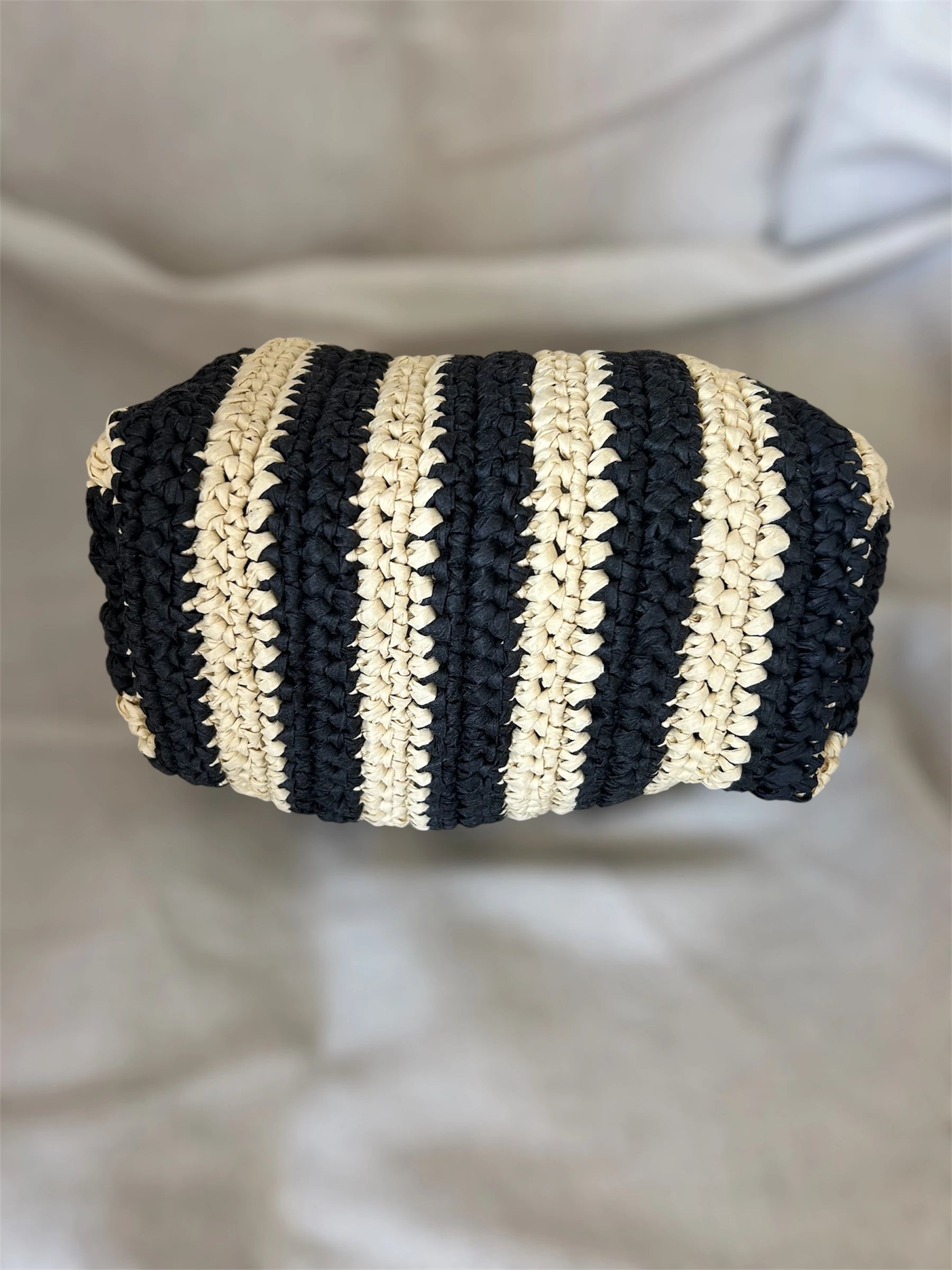 Épure et contraste pour cette pochette entièrement crochetée à la main, dont les rayures graphiques évoquent les jeux d’ombre et de lumière d’un bord de mer en fin de journée.