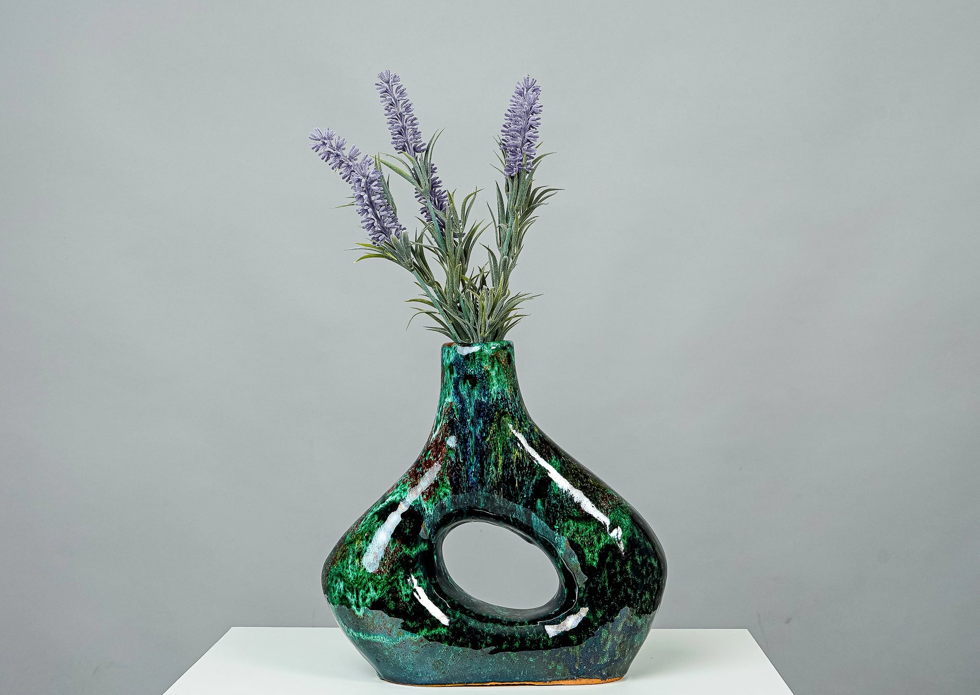 Apportez une touche d'élégance et d'authenticité à votre intérieur avec ce vase en céramique vert Tamegroute, pièce emblématique de l'artisanat marocain. Fabriqué à la main dans le village de Tamegroute, réputé pour ses techniques de poterie ancestrales, ce vase se distingue par sa couleur vert émeraude unique, obtenu grâce à un savoir-faire transmis de génération en génération. Chaque vase, avec ses nuances et irrégularités, est une pièce unique qui raconte l'histoire du Maroc et de ses artisans.